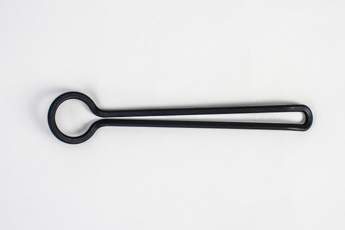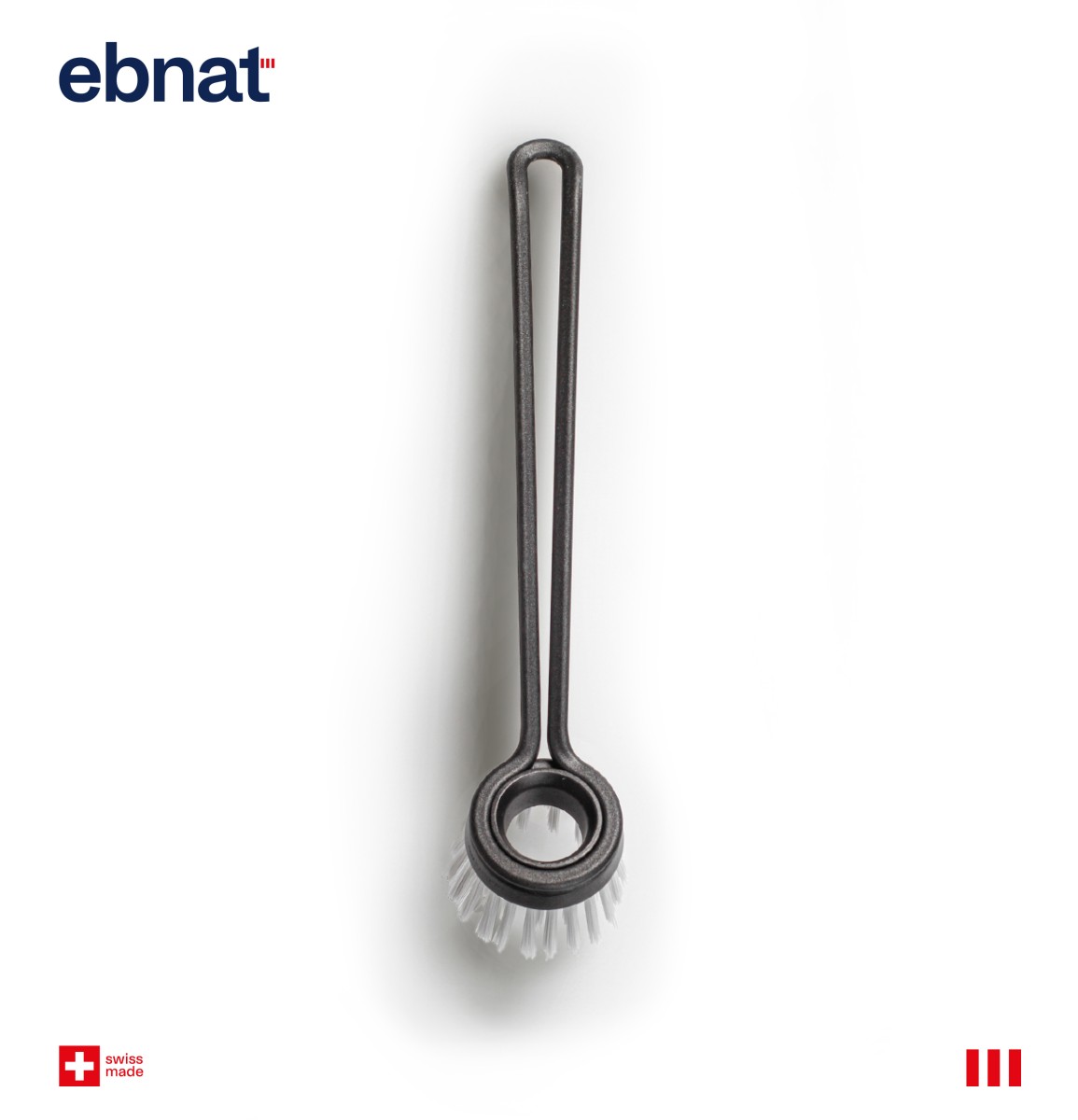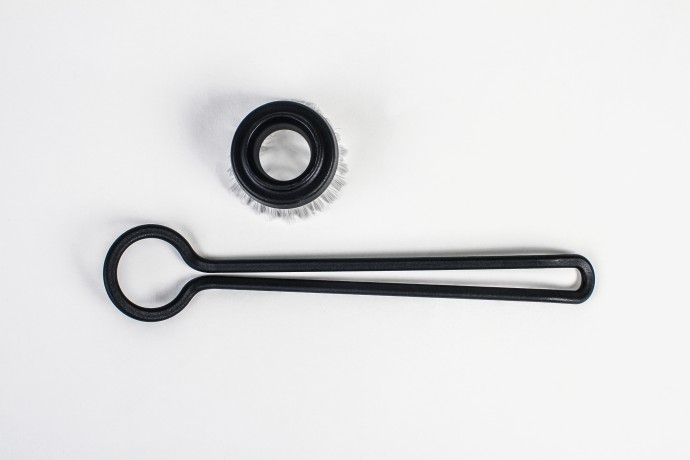 Der Stiel besteht lediglich aus einem schlanken Rahmen, der den Bürstenkopf umschliesst. Auch der Bürstenkopf selbst ist durch das zentrale Loch minimalistisch gehalten.