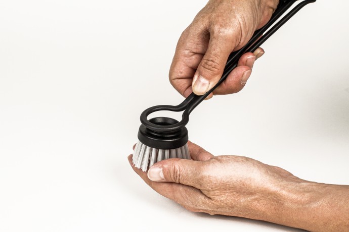 Der Stiel besteht nur aus einem Rahmen, der den Bürstenkopf umschliesst. Auch der Bürstenkopf selbst ist durch das Loch minimalistisch gehalten. Im Vergleich zu unserer bisher leichtgewichtigsten Wechselkopf-Abwaschbürste konnten wir damit den Materialverbrauch um ca. 50 % reduzieren.