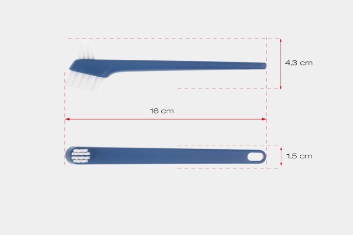 Die speziell angeordnete Borstengeometrie kombiniert flachen Schnitt für Prothesenoberflächen mit spitz zulaufenden Büscheln, die auch schwer erreichbare Zonen gründlich säubern. So entfernt die Prothesenbürste zuverlässig Beläge, ohne die Oberfläche zu verkratzen.