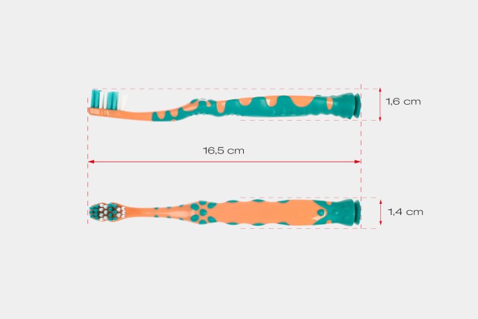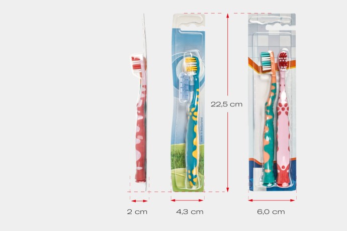 Die Kids-Zahnbürste ist optimal auf die Bedürfnisse von Kindern im Milchzahn-Alter abgestimmt. Der etwas grössere Bürstenkopf mit weichen Borsten und leichtem Stufenschnitt ermöglicht eine schonende und zugleich gründliche Reinigung der Milchzähne. Der ergonomische Griff mit TPE-Antirutschflächen liegt sicher in kleinen Händen und unterstützt die selbstständige Zahnpflege – wahlweise mit normalem Griff oder mit praktischem Saugnapf am Griffende. Dank der Materialkombination aus flexiblem TPE und robustem PP wird der Druck auf Zähne und Zahnfleisch sanft abgefedert. Verpackt in Blister, Kartonbox, Cello oder Bulk, bietet die Kids-Zahnbürste flexible Lösungen für unterschiedliche Märkte. Entwickelt in Zusammenarbeit mit einer Schweizer Universität, steht sie für geprüfte Qualität, Sicherheit und kindgerechte Mundhygiene.