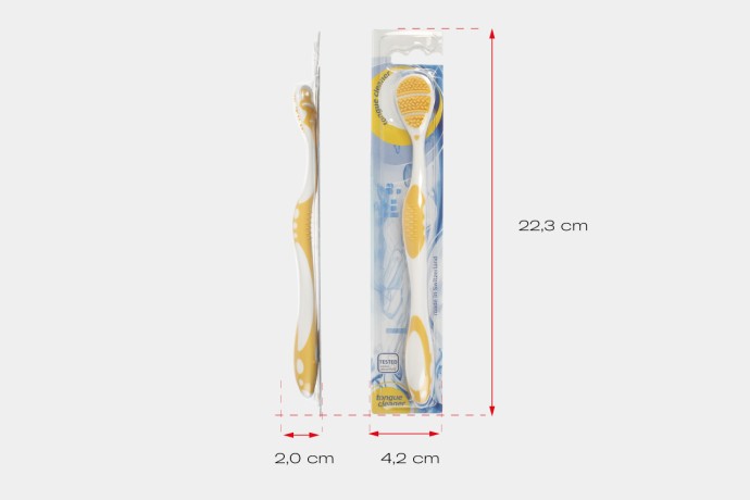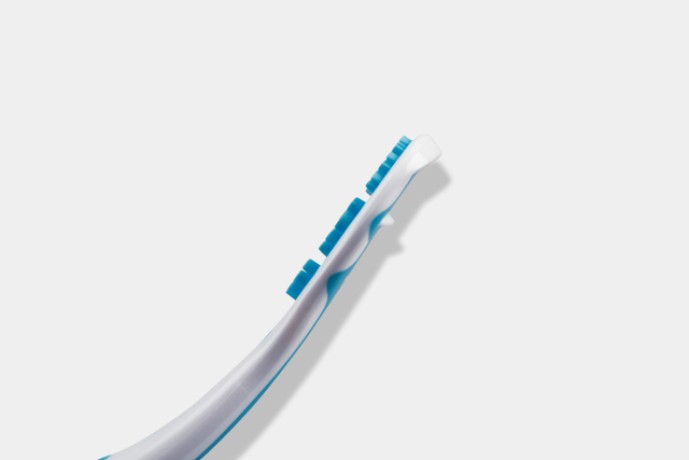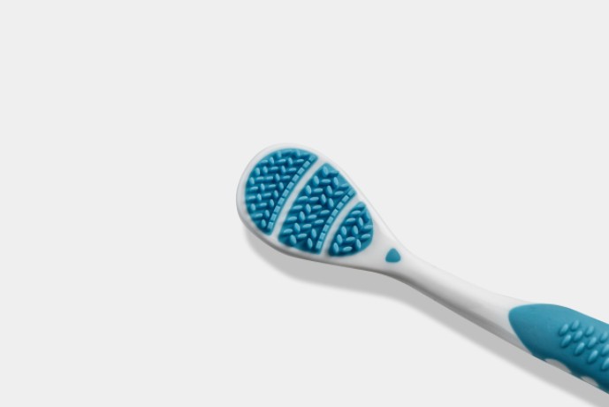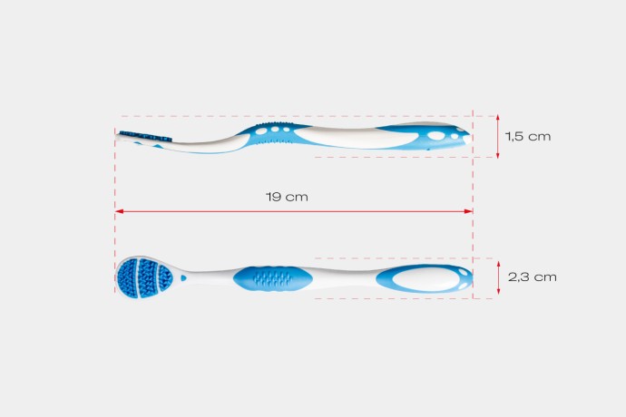 Auf der Rückseite ermöglichen feine Abstreifkanten eine präzise und angenehme Reinigung. Durchziehende Bewegungen lässt sich der gelöste Belag effektiv entfernen. Der extra-flache Kopf sorgt dabei auch im hinteren Zungenbereich für komfortable Anwendung – ohne Würgereiz.